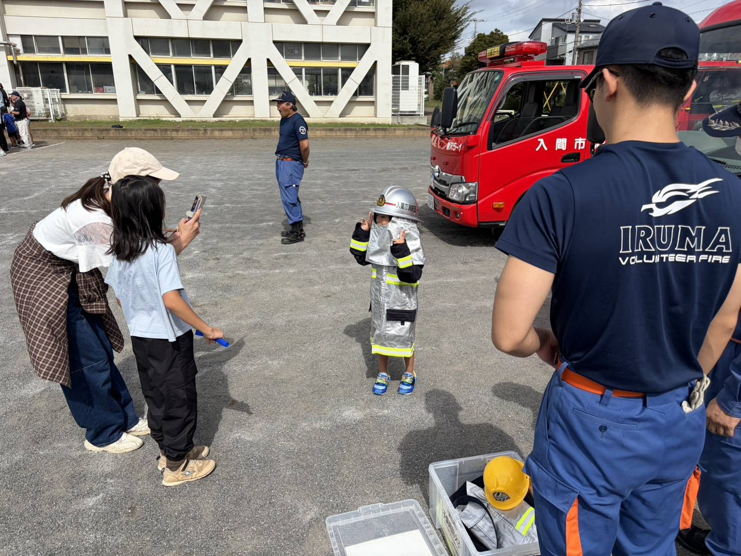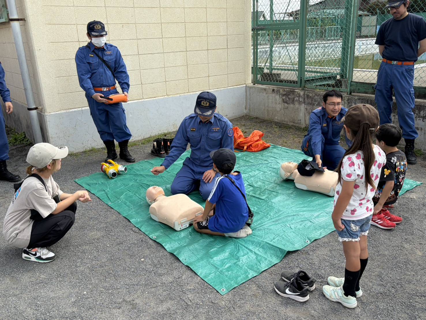 それぞれ、AEDの使い方や消防車に積載されている機材等について、団員に多くの質問をいただき、実際に触れながら体験して頂きました。