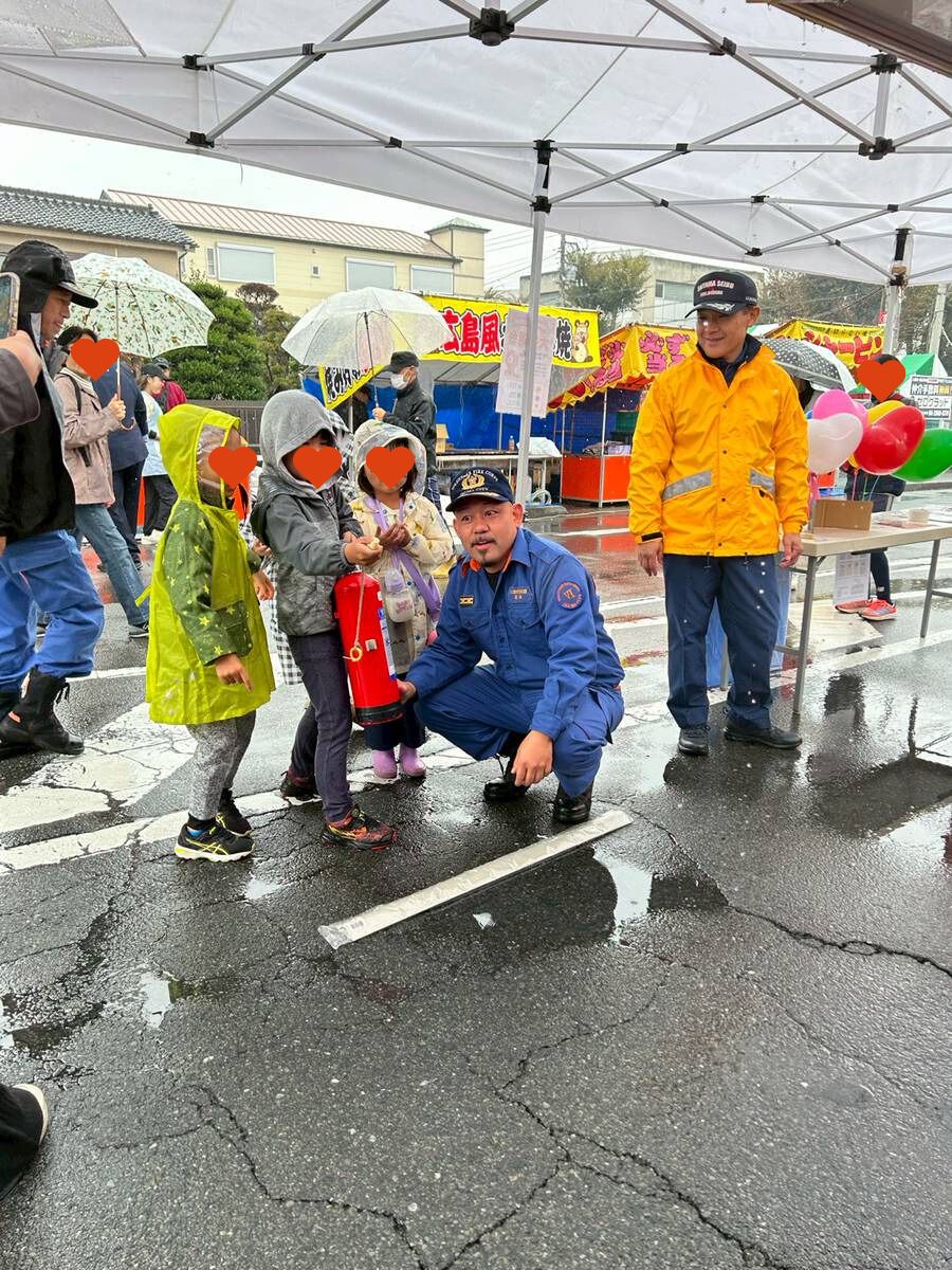 子供用防火衣着装体験、消防車乗車体験、水消火器体験を行いお子様の笑顔、お父さんお母さん、お爺ちゃんお婆ちゃんの見守る笑顔、我々消防団員も素敵な時間を過ごさせて頂きました。