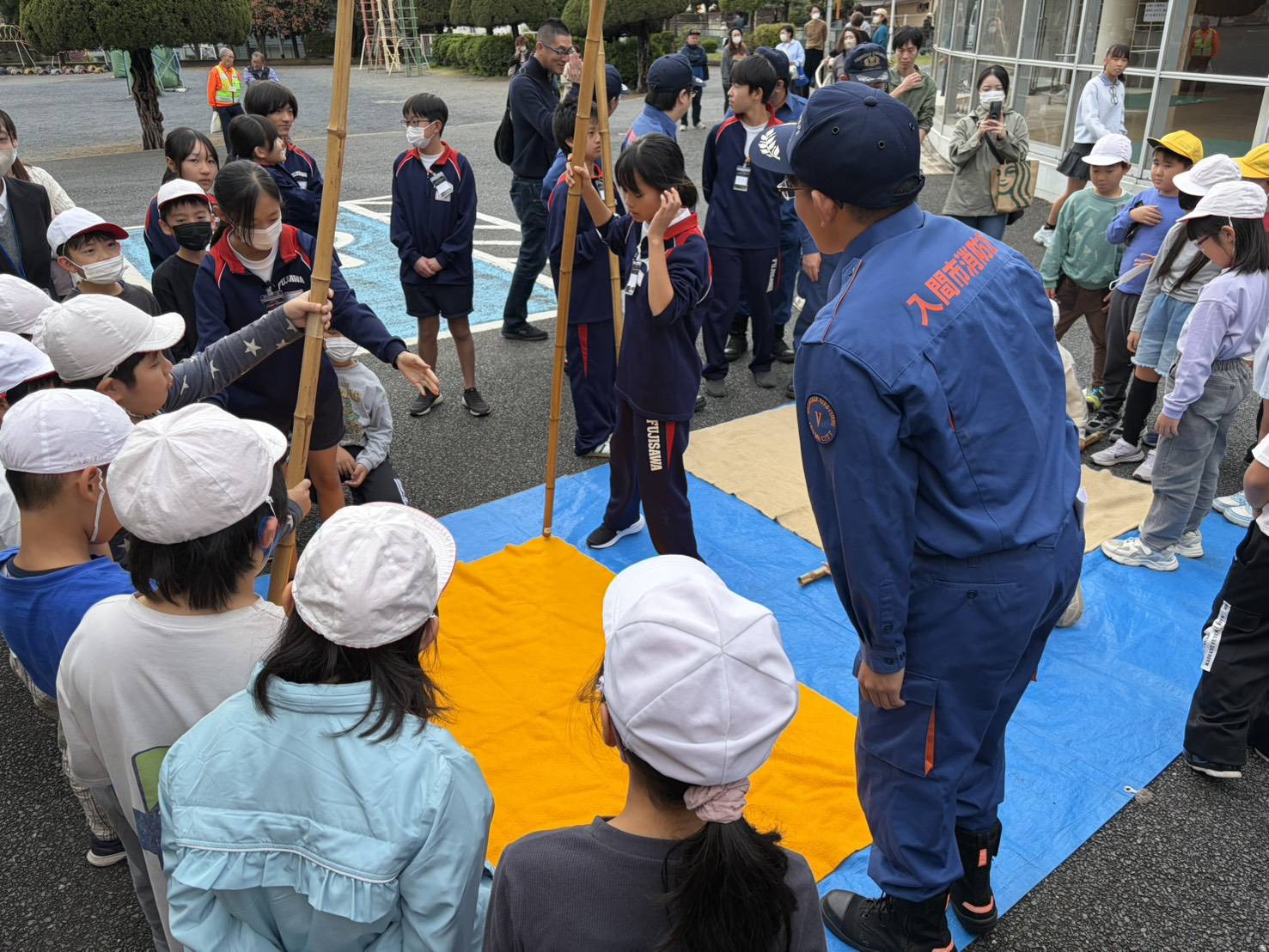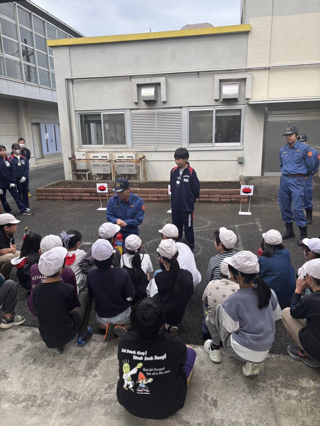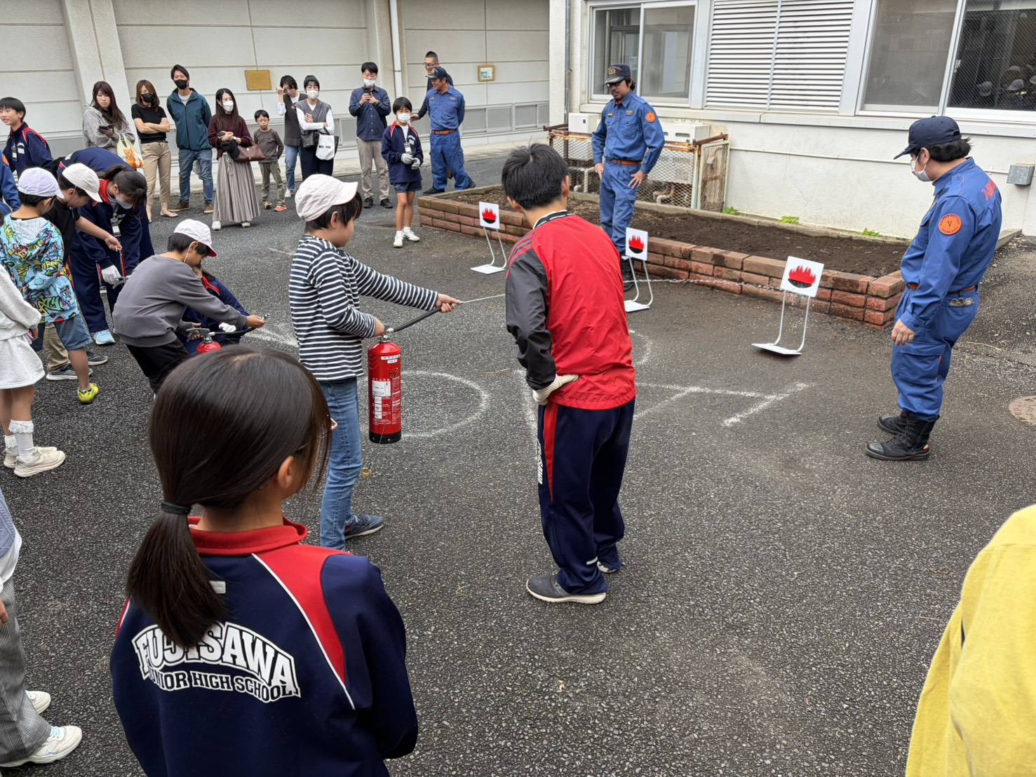 11月1日(土) 第5分団は、藤沢小学校学校公開日3年生の公開授業に参加しました。 地元の子どもたちに消防団をPRするとともに、防災意識を高めるための授業です。 今回は地震後の火災を想定して各教室から外に避難した後、クラスに分かれて水消火器の訓練、簡易担架作製訓練を体験しました。 体験には、藤沢中学校の生徒ボランティアが15名も駆けつけてくれました。 中学生のお兄さん・お姉さんにお手本を見せてもらい、子どもたちは自分の力で、安全に体験を行いました。