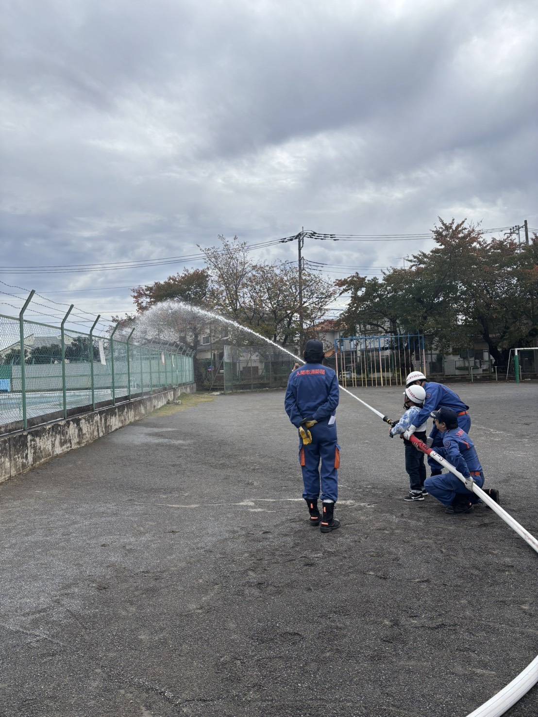 そして、最後には消防車からの放水体験です。まずは消防団の放水展示、その後に消防団の補助のもと、中学生ボランティア、小学生の子どもたちも放水の勢いの強さを体験しました。 子どもたちからは、「思っていたよりも重い」「少しの時間だけど大変だった」との声。 学校公開日とあって多くの保護者にも囲まれ、親子ともども地元の防災について考えていただくとともに、消防団との交流を深めることにもつながった一日でした。