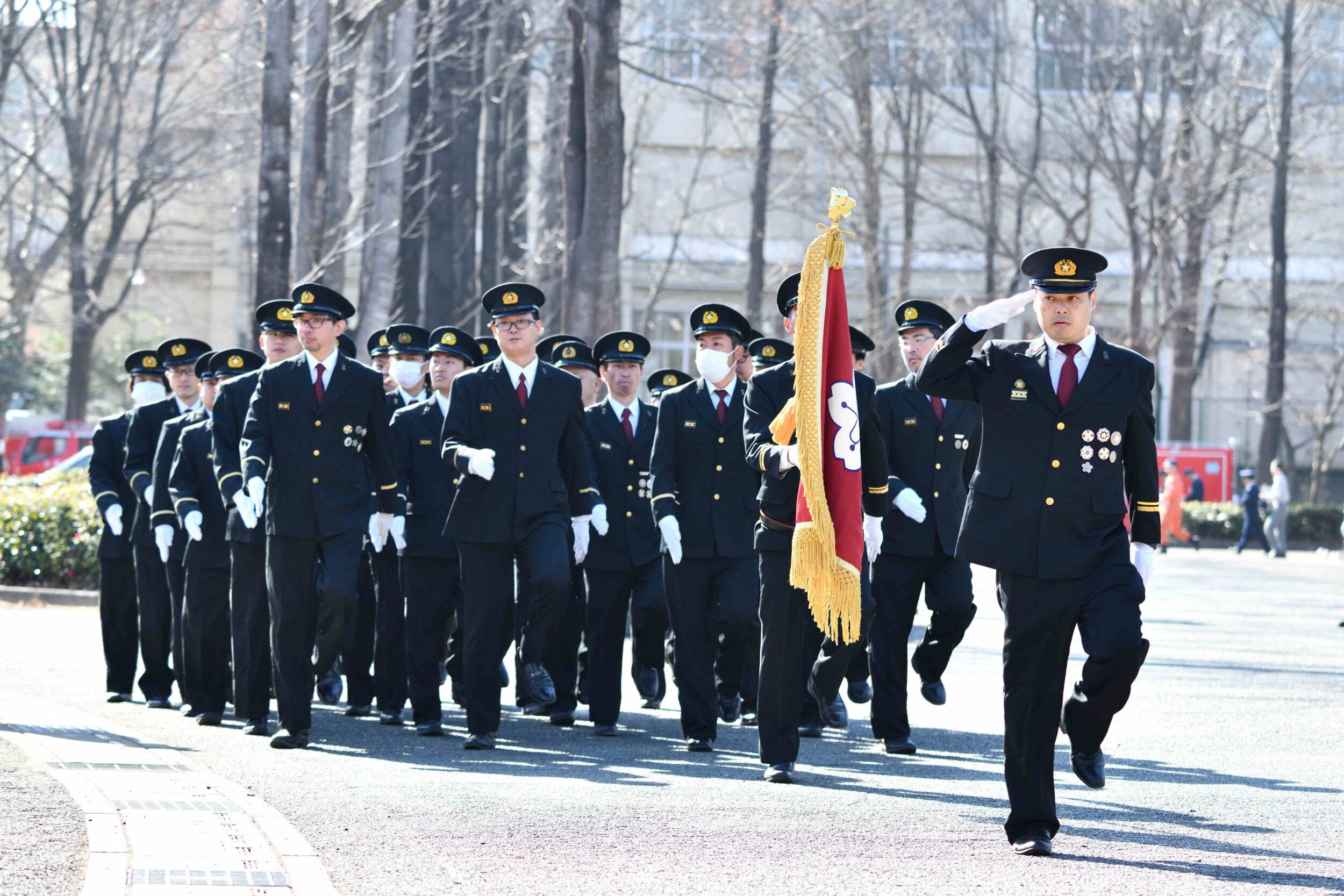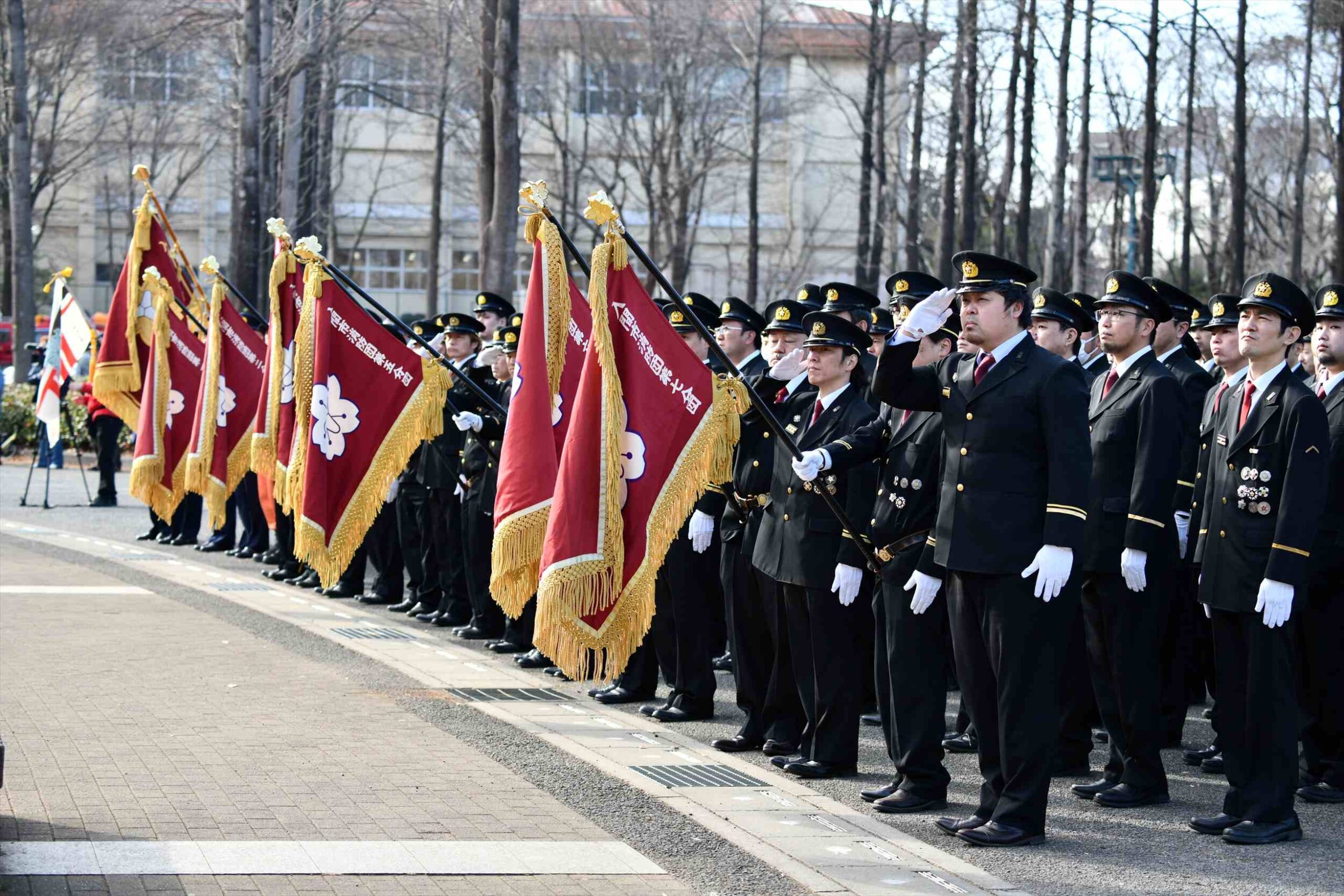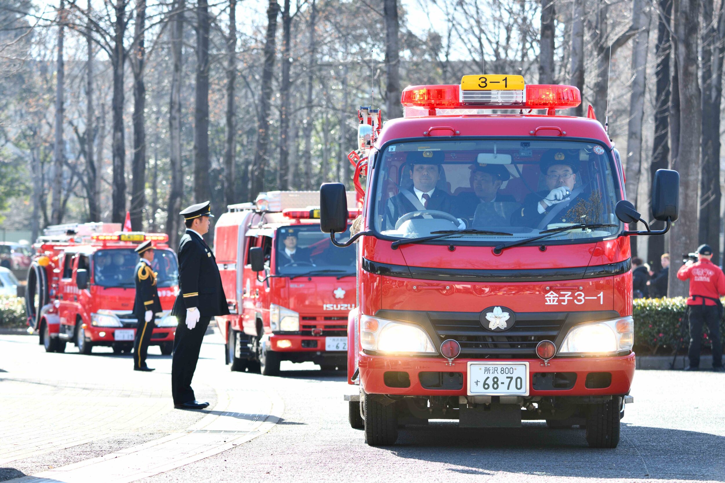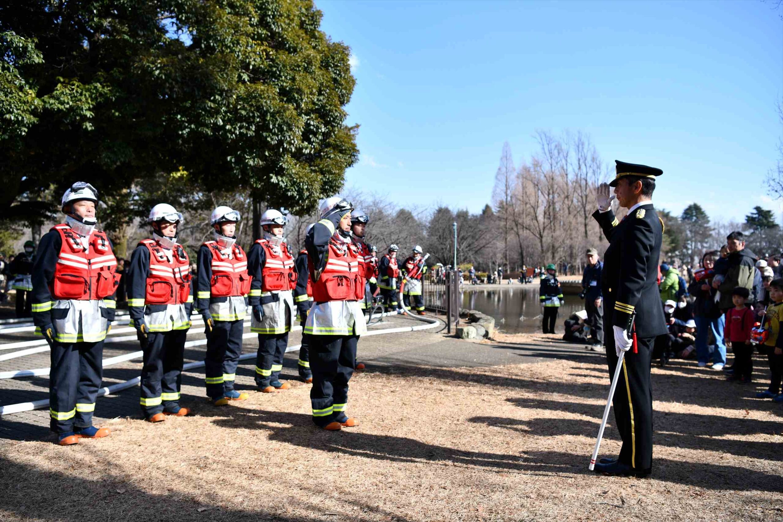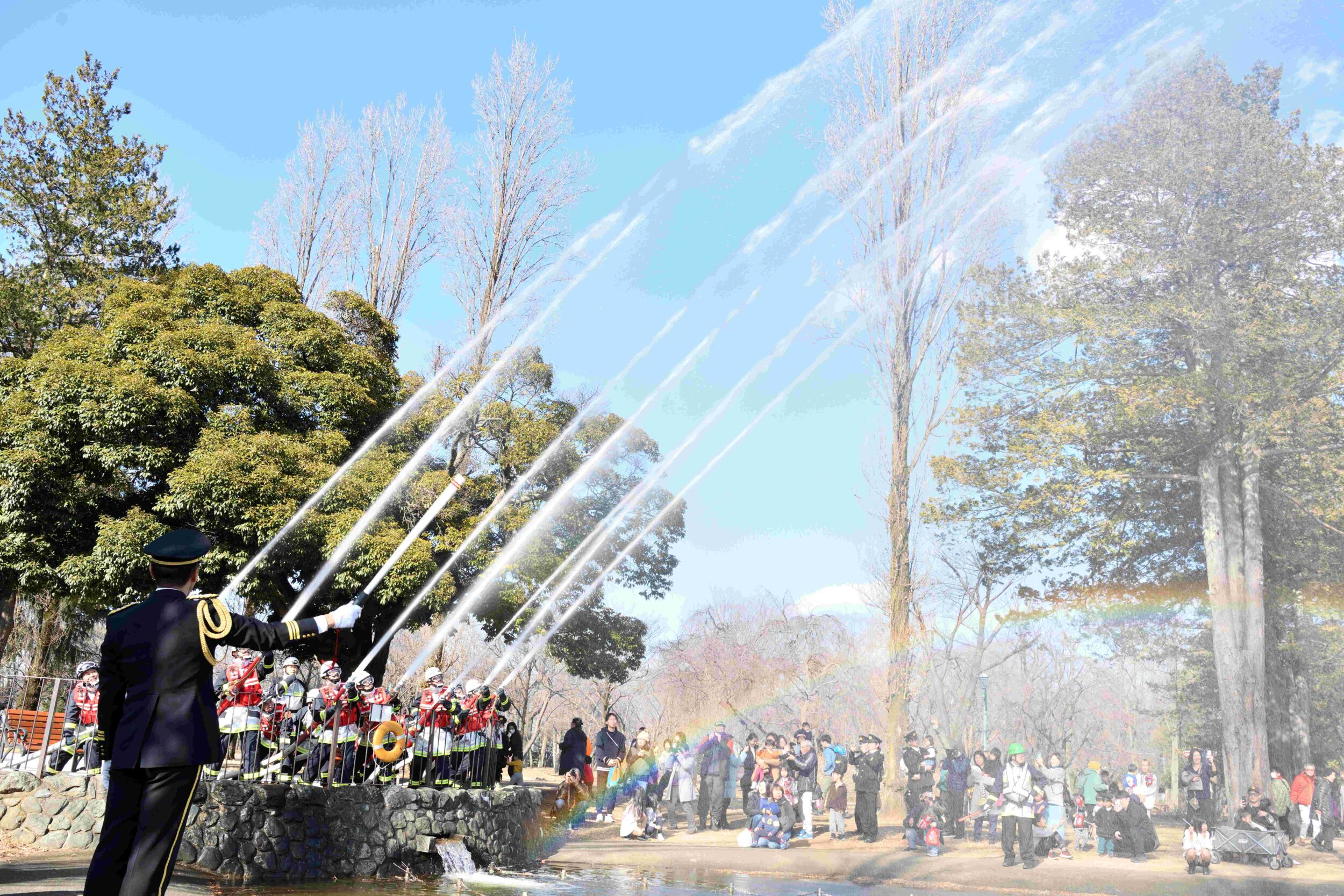消防団としては、車両行進及び分列行進を行い、団の装備とともに、普段から培っている団としての規律を市民の皆さんにご覧いただくことができました。また、一斉放水訓練展示では入間消防署から梯子(はしご)車も参加して華を添えていただきつつ、防火を祈願して入間市の青空に約2000リットルの水を放ちました。当日は、例年にも増して多くの方々にお越しいただきありがとうございました。今後も地域の安心・安全を守るため日々しっかりと活動して行きたいと思います。