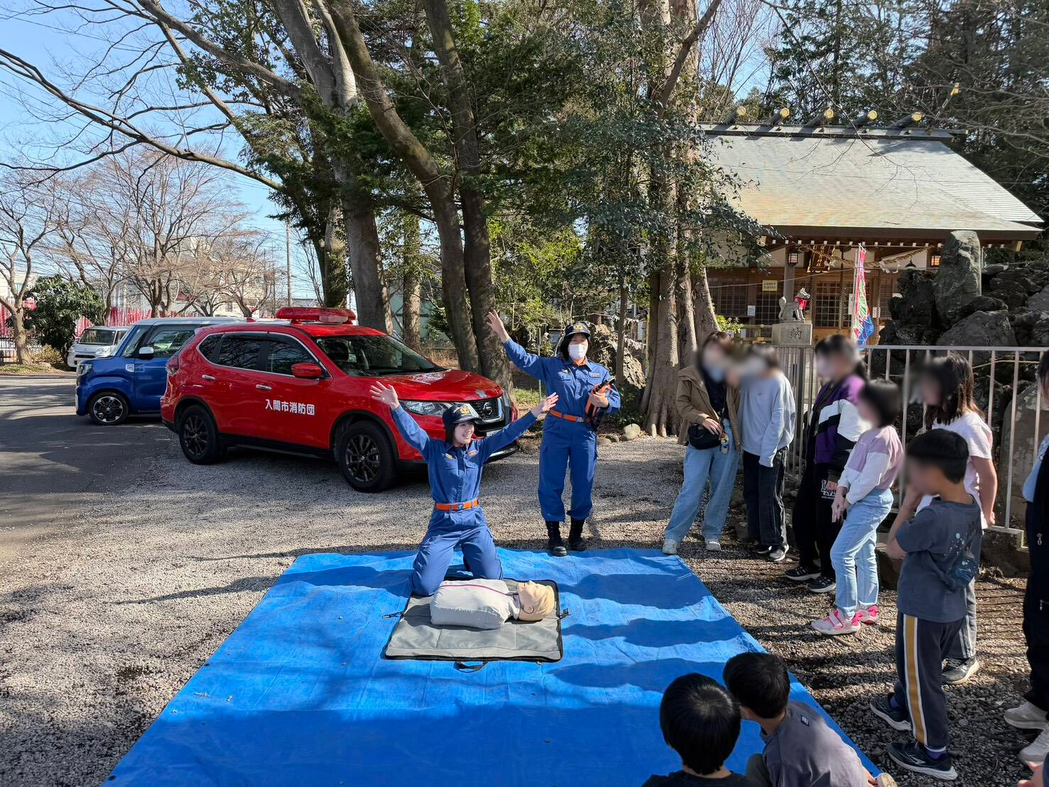 2月28日(土)、扇第2地区子ども会の活動に合わせ、久保稲荷神社を会場に、女性消防団員が中心となって第5分団と消防体験を行いました。