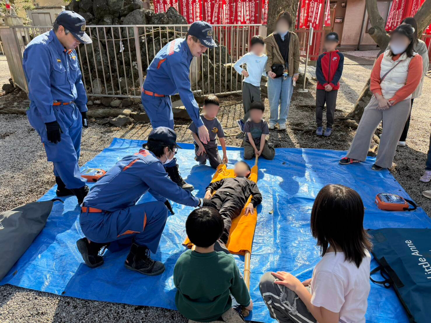 みんなで人形を囲み、子どもたちと保護者の皆さんが消防団員と協力して臨めた訓練となりました。